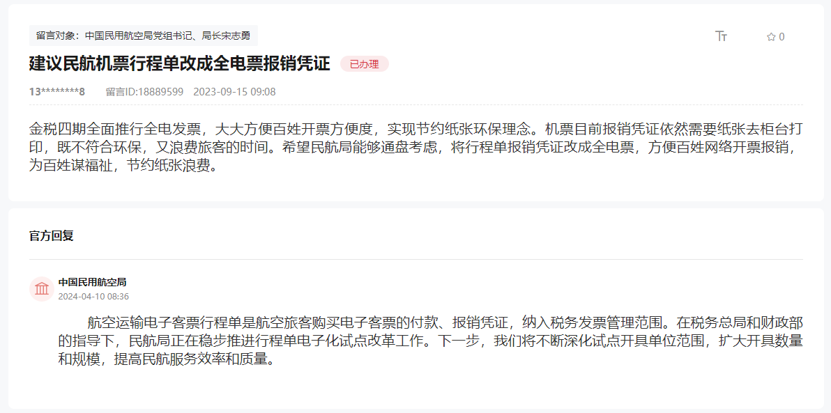 有网友通过“领导留言板”留言,希望民航局能够将行程单报销凭证改成在线开具,方便百姓网络开票报销,为百姓谋福祉,同时减少纸张浪费。
