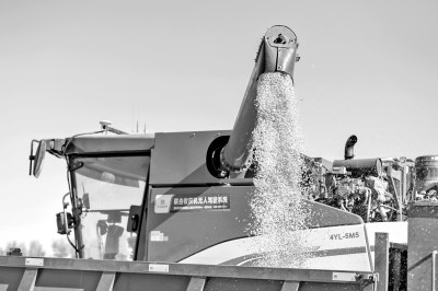 在中国科学院“黑土粮仓”科技会战长春示范区公主岭示范基地,无人驾驶农机将收获的玉米装车。